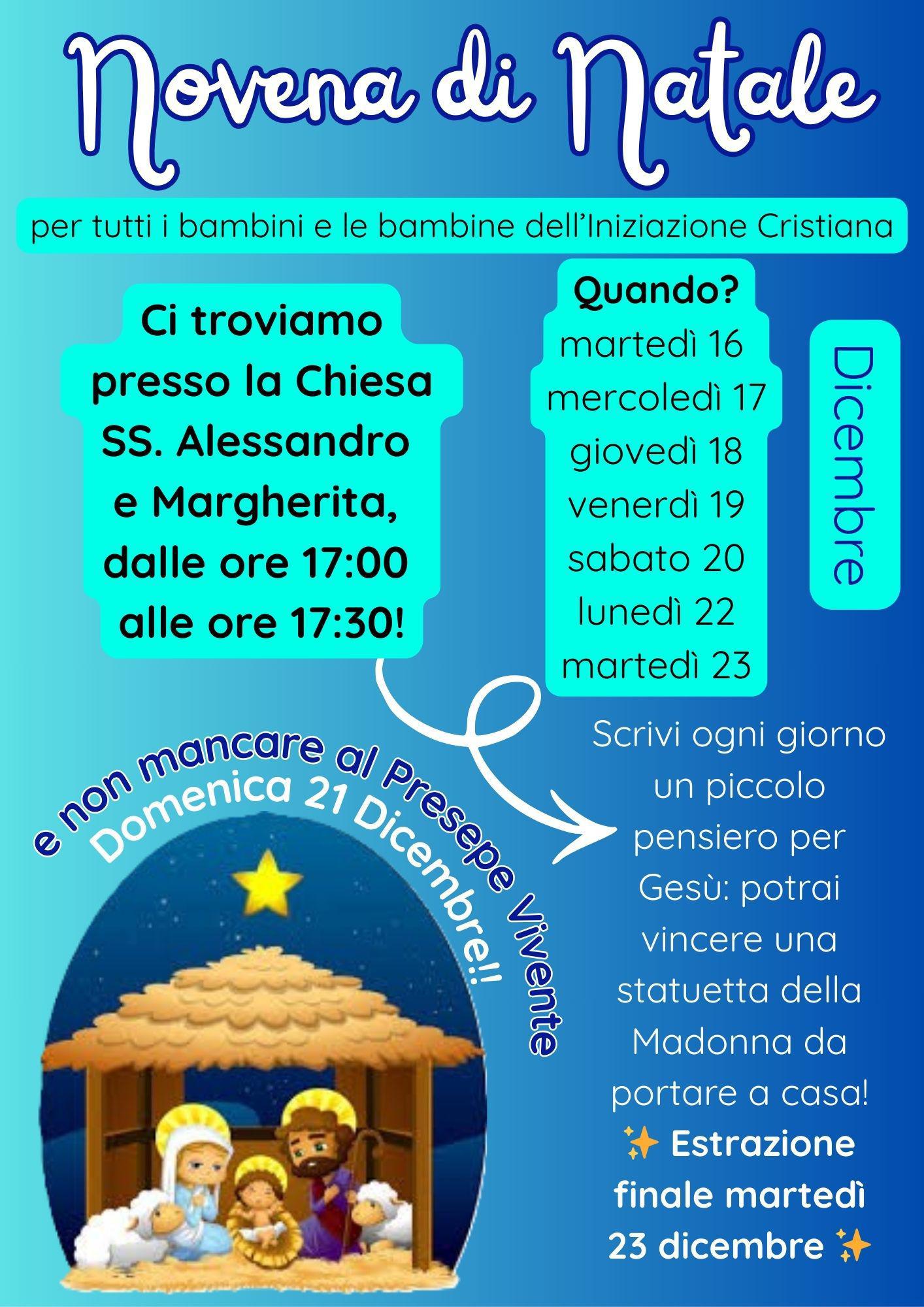 A differenza di quanto precedentemente comunicato, gli incontri della Novena dedicati ai bambini e alle bambine dell'Iniziazione Cristiana si svolgeranno presso la Chiesa Sant'Alessandro e Santa Margherita dalle 17:00 alle 17:30, a partire da martedì 16 dicembre.