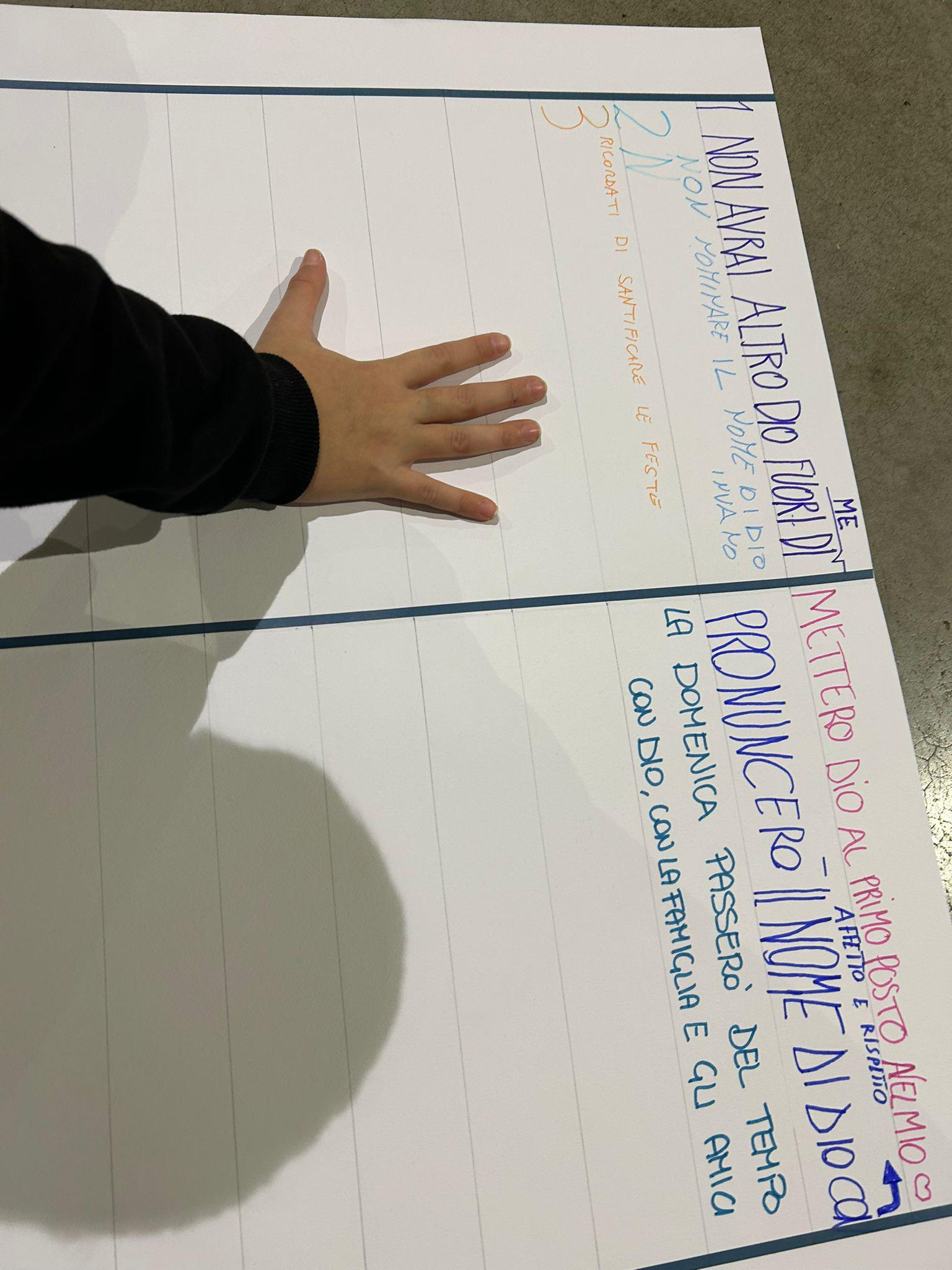 I bambini di quarta primaria hanno imparato attraverso la narrazione di storie i primi tre Comandamenti! Dopo aver letto e riflettuto insieme su significati delle storie, hanno scritto su un grande cartellone una promessa per ciascuno di essi, ad esempio per il Comandamento: “Non nominare il nome di Dio invano” la promessa è “Pronuncerò sempre il nome di Dio con amore e rispetto”